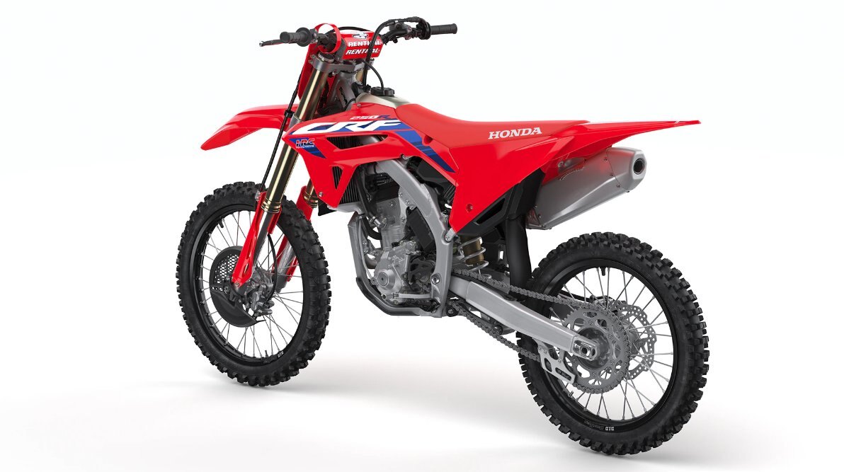 Low rear shock mountWith its low rear shock mount on the frame, the CRF250R benefits from both a lower center of gravity (cg) as well as chassis stability. Our Pro-Link design lets us give the 2024 CRF250R 12.3 inches of suspension travel, along with a lightweight spring. All resulting in a plush, controlled ride. |